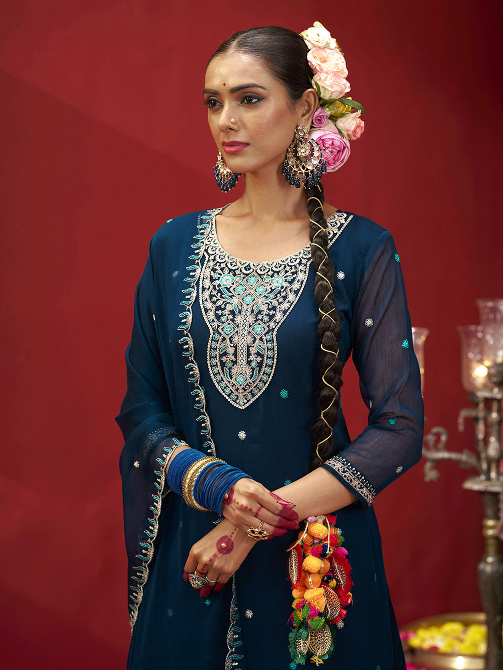 Step into elegance with this stunning Navy Blue Anarkali Suit Set. The deep blue hue, complemented by intricate silver and golden embroidery, creates a regal and sophisticated look. Perfect for weddings, festive occasions, or any celebration, this ensemble is designed to make you feel graceful and chic.