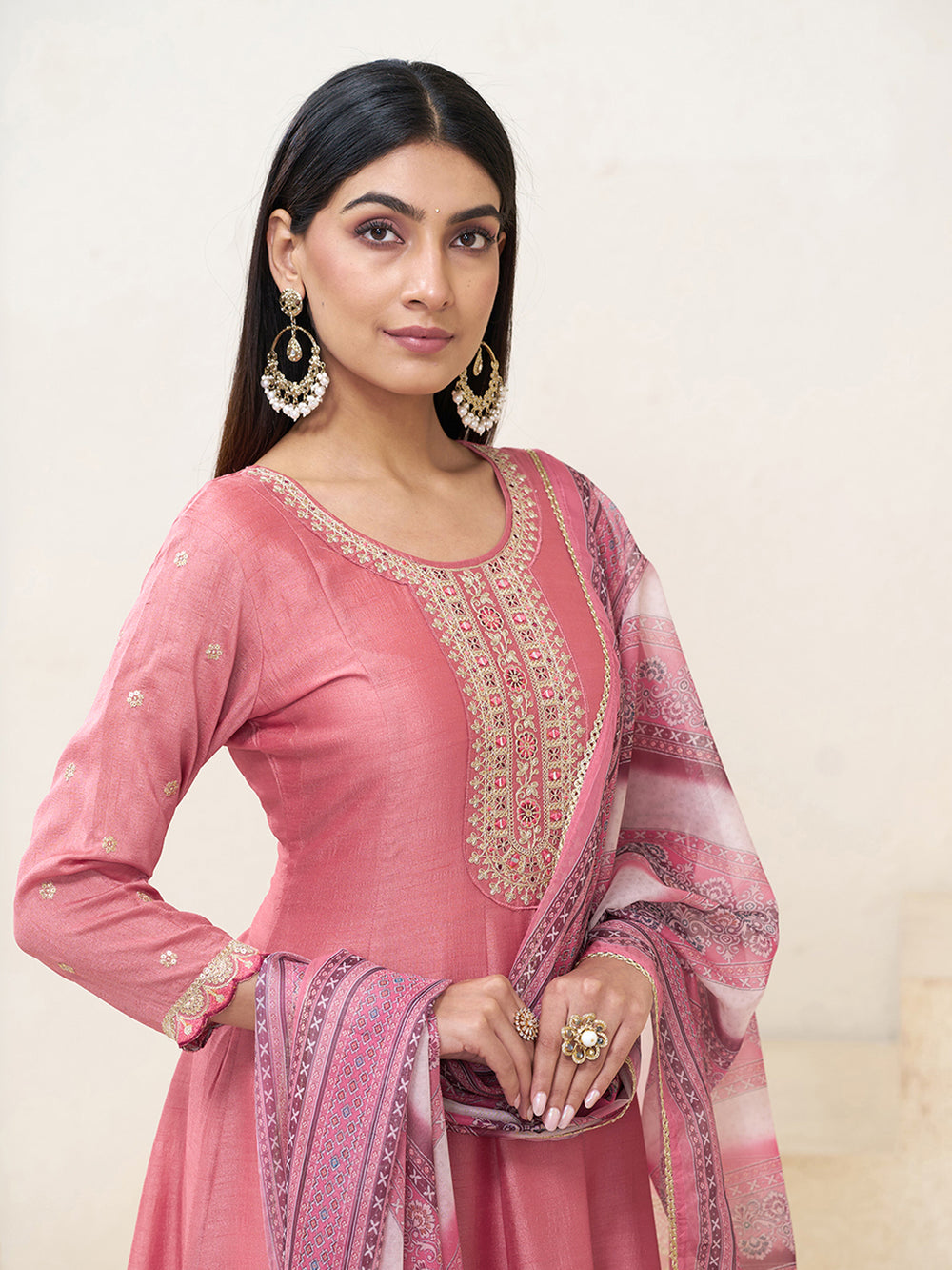 Delicate and elegant, this soft pink Anarkali suit is perfect for special occasions. The intricate floral embroidery along the neckline and hem adds a luxurious touch, while the flowing silhouette creates a graceful look. The complementing dupatta, with its beautiful patterns and tassel embellishments, enhances the outfit’s charm. Ideal for weddings, festivals, or any formal event, this Anarkali suit will surely make you stand out in style.
