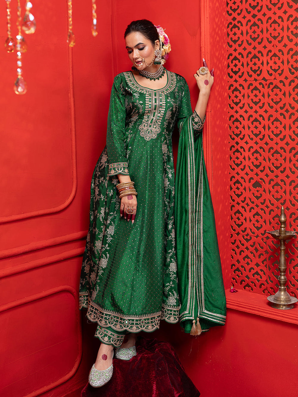 Pair this Green Anarkali set with traditional chandbalis, gold-toned bangles, and embroideGreen juttis for a royal festive look. Ideal for wedding ceremonies, receptions, and cultural festivities.
