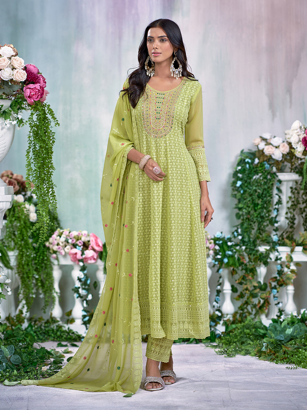 This graceful green Anarkali suit exudes elegance with its intricate floral embroidery and fine detailing. Designed for those who seek beauty in simplicity, the suit is made with breathable fabric that ensures comfort while offering a refined look. The embroidery along the neckline and hem, combined with a delicate floral dupatta, adds a touch of charm. Whether you're attending a wedding, festival, or any festive gathering, this Anarkali suit is your go-to choice for a standout appearance.
