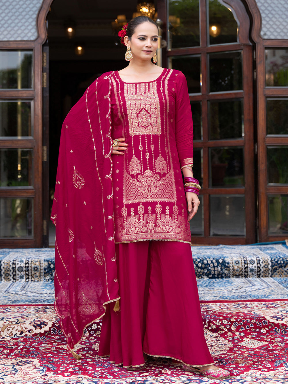This vibrant red Anarkali-style suit features intricate gold embroidery, adding an elegant and regal touch to the classic silhouette. The beautifully detailed kurta is paired with a flowy palazzo and a contrasting sheer dupatta, making it perfect for weddings, festivals, or other special occasions.