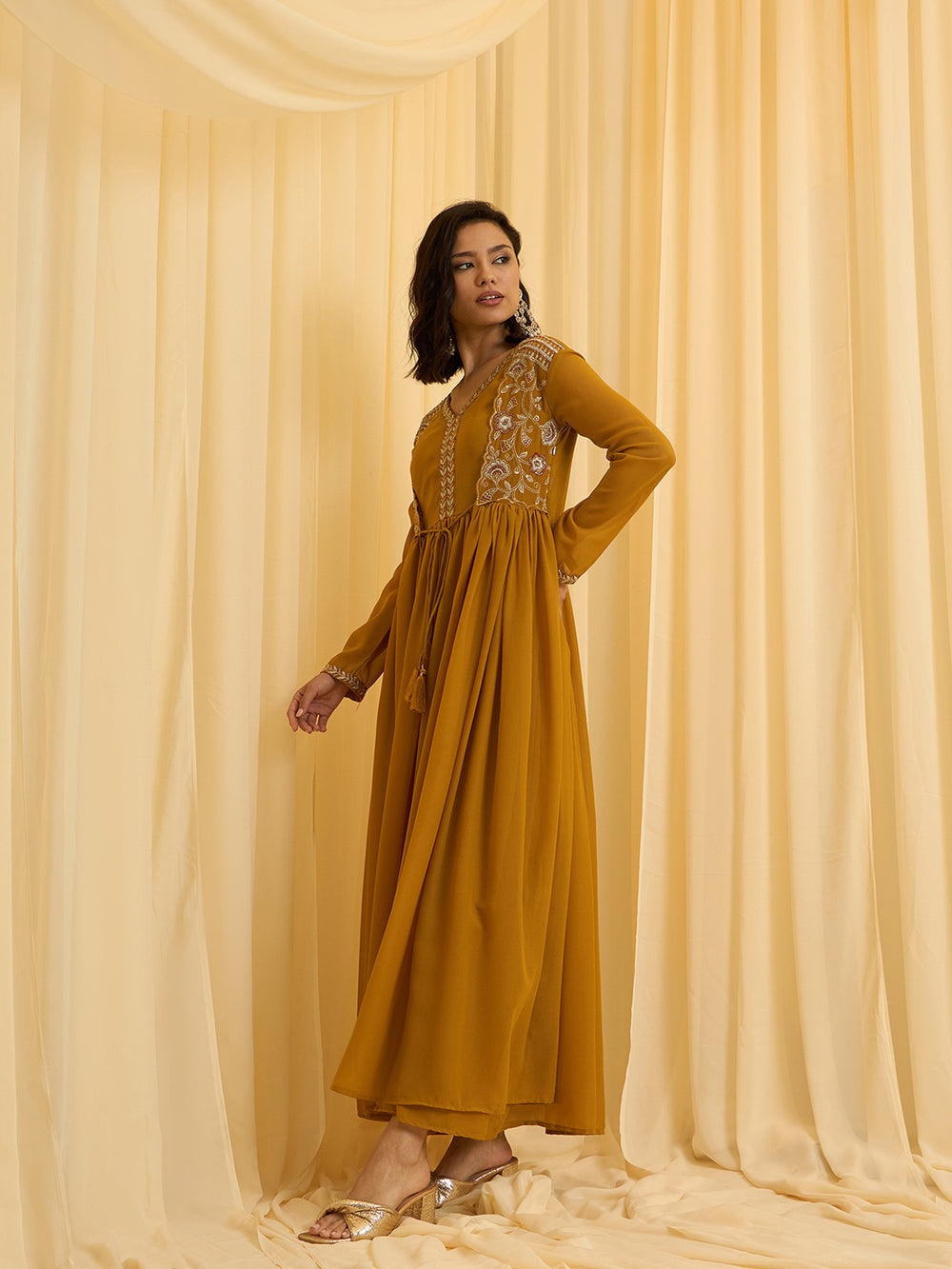 This elegant mustard yellow Anarkali suit is the perfect combination of modern design and traditional charm. The delicate embroidery around the neckline and waist creates a beautiful contrast with the flowing, pleated skirt. The tassel details and the relaxed silhouette make it ideal for weddings, festivals, or any celebration where you want to shine. The Anarkali cut ensures comfort while maintaining an effortlessly graceful look.