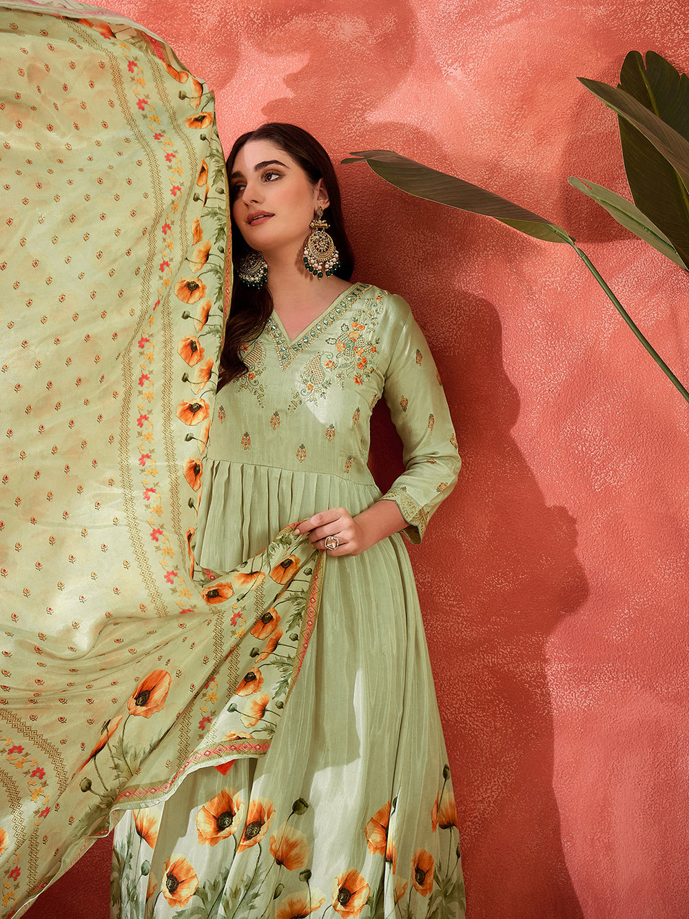This stunning mint green Anarkali suit features delicate floral embroidery and a striking orange poppy design at the hem, giving it a perfect balance of elegance and vibrancy. The soft fabric and rich colors make this an ideal choice for weddings, festive events, or celebrations.