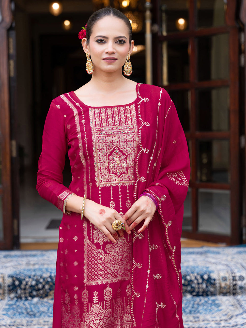 Elevate your festive style with this magenta pink Jacquard kurta set, beautifully adorned with intricate handwork embroidery. Paired with flowy palazzo pants and a matching embroidered dupatta, this set is a timeless blend of tradition and elegance.