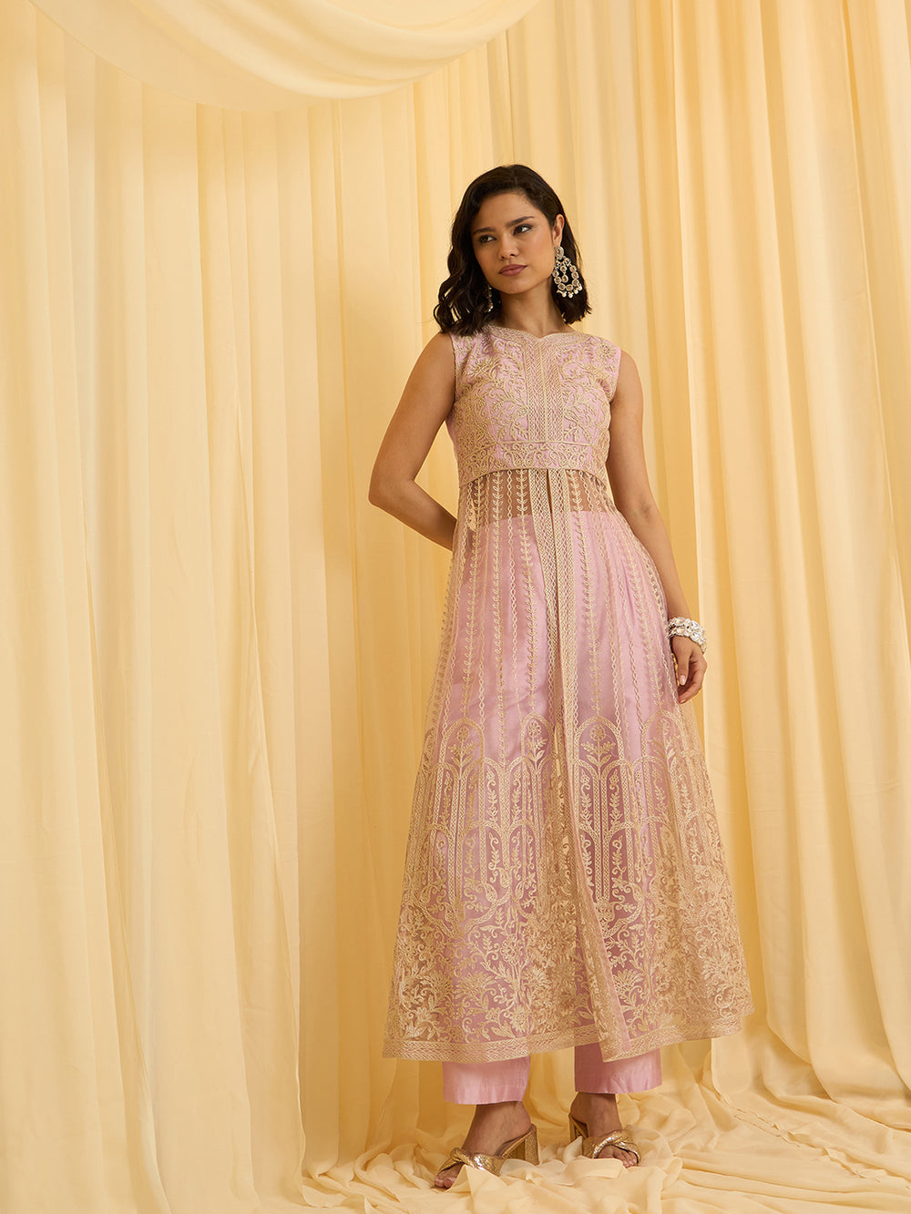 This blush pink embroidered long jacket set brings a delicate and feminine touch to your festive wardrobe. The sleeveless jacket features intricate gold embroidery that beautifully outlines the neckline and flows down the length, creating a stunning visual effect. The elegant sheer fabric gives the jacket a soft, ethereal look, perfect for those seeking a refined style with a hint of glamour.