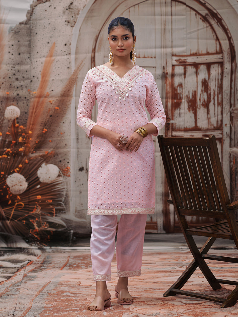 Effortless elegance meets everyday comfort in this blush pink cotton chikankari kurta set. Featuring delicate cutwork embroidery, a flattering V-neckline, and coordinated straight-fit pants, this outfit is perfect for casual gatherings, festive brunches, or graceful day wear.
