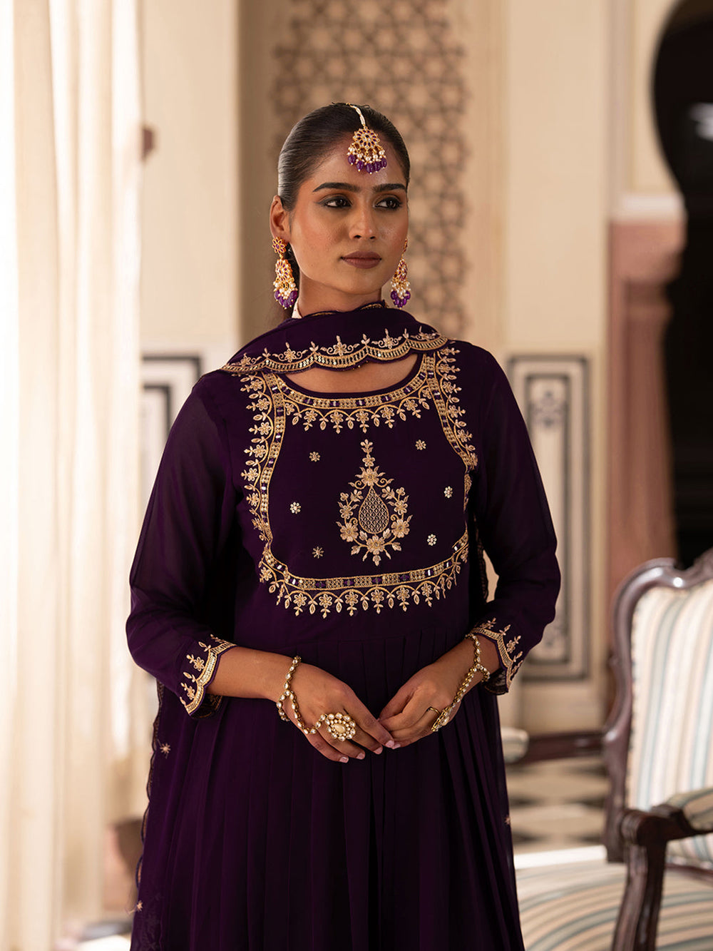 Pair this Purple Anarkali set with kundan jewelry, statement earrings, and embellished juttis to complete a majestic festive look. A timeless choice for wedding ceremonies and grand events.