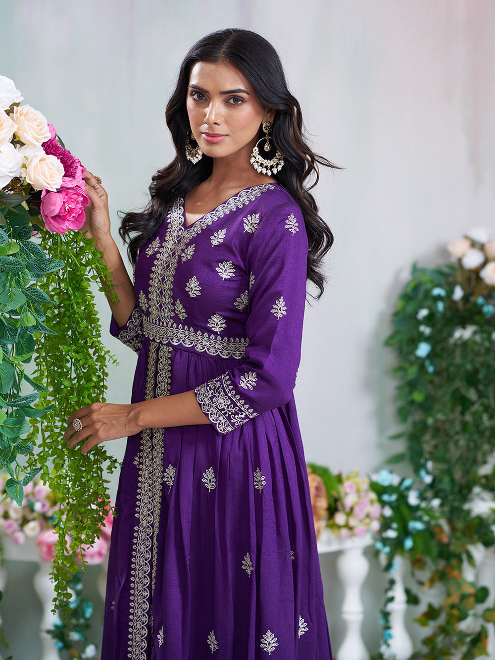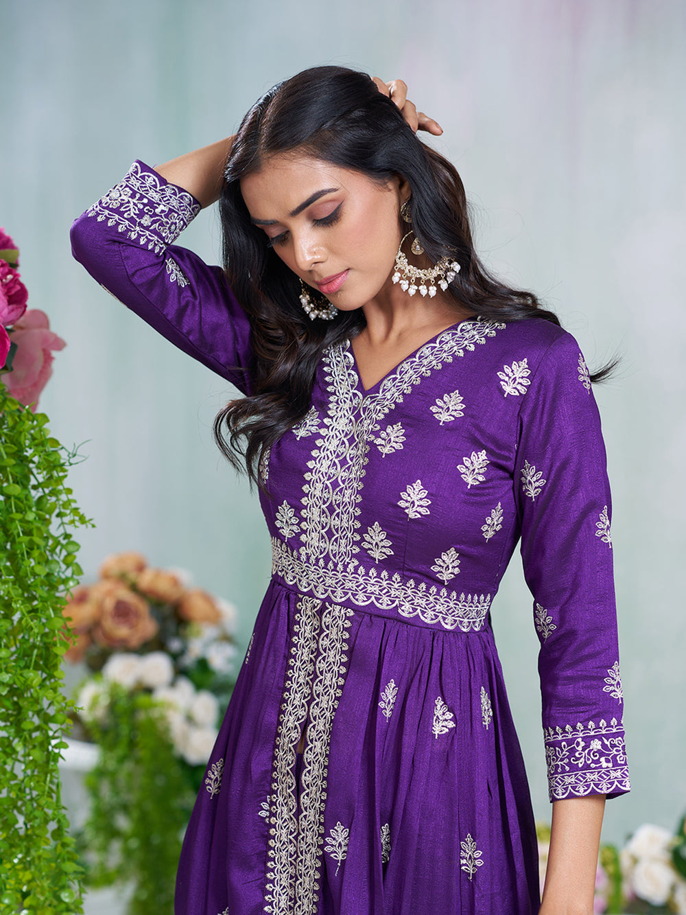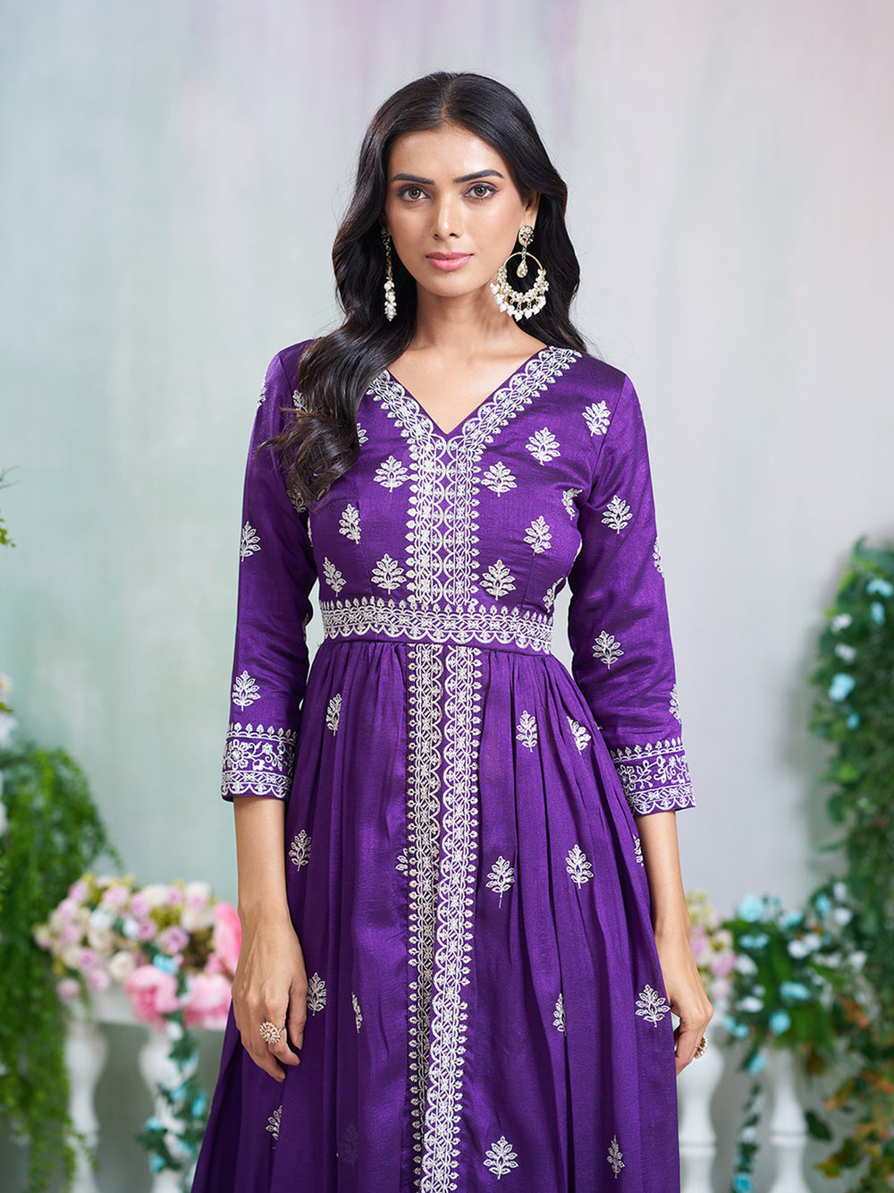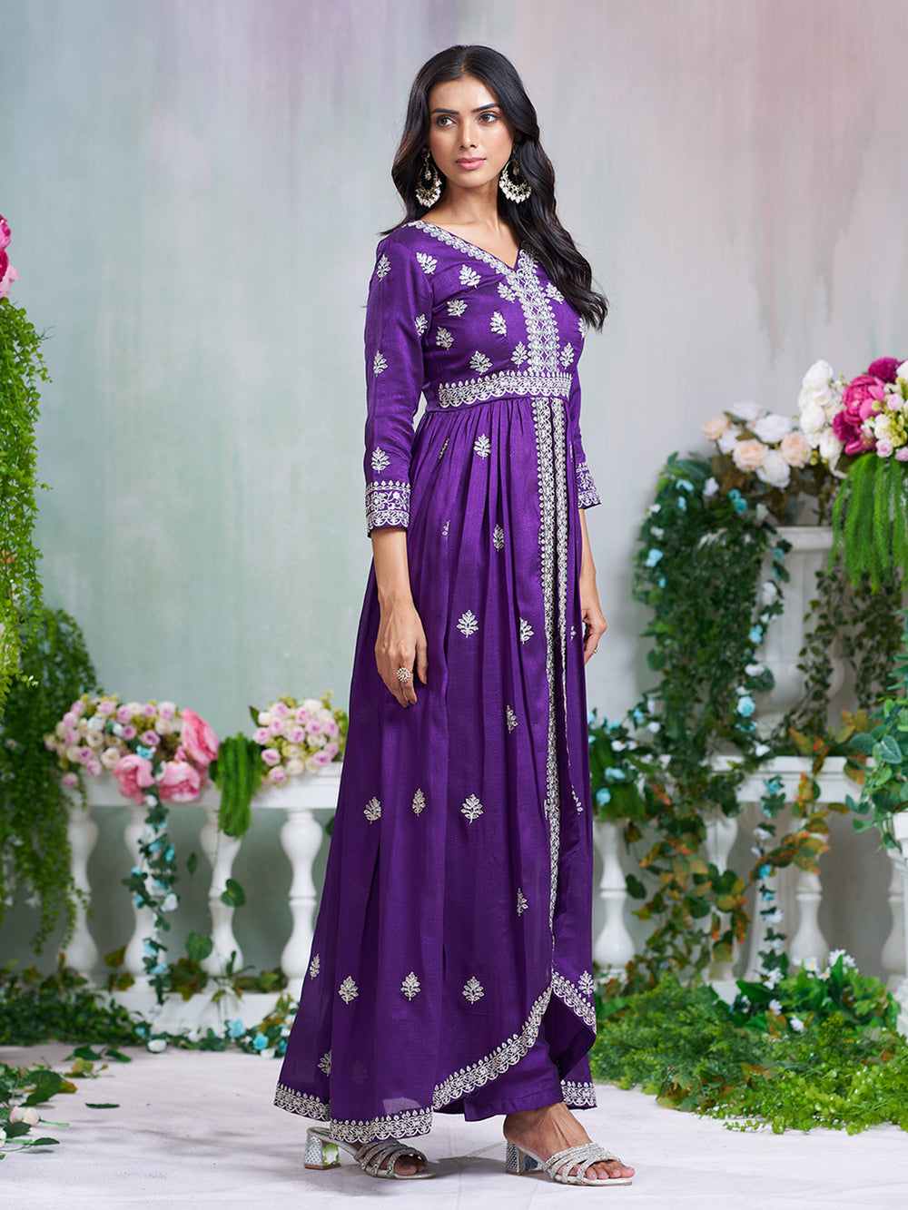 Step into elegance with this stunning purple Anarkali suit, designed to make you shine at any special occasion. The intricate silver floral embroidery around the neckline, bodice, and sleeves adds a touch of sophistication, while the flowing silhouette creates a graceful look. Perfect for weddings, festivals, and other grand celebrations, this Anarkali suit combines tradition and modern flair.