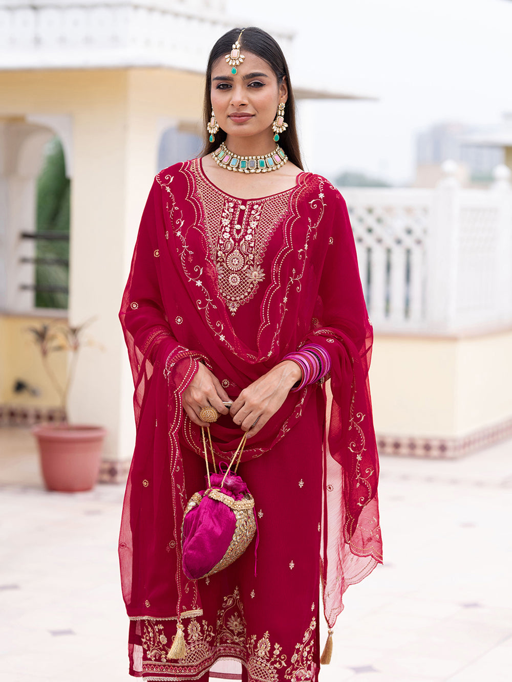 Celebrate elegance with this Radiant Red Anarkali Suit Set. The rich red fabric, coupled with intricate golden embroidery, brings out the perfect blend of tradition and sophistication. Ideal for weddings, festive occasions, or any special event, this ensemble ensures that you stand out with grace and poise.