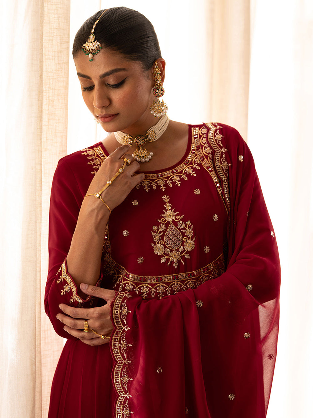 Pair this red Anarkali set with kundan jewelry, statement earrings, and embellished juttis to complete a majestic festive look. A timeless choice for wedding ceremonies and grand events.