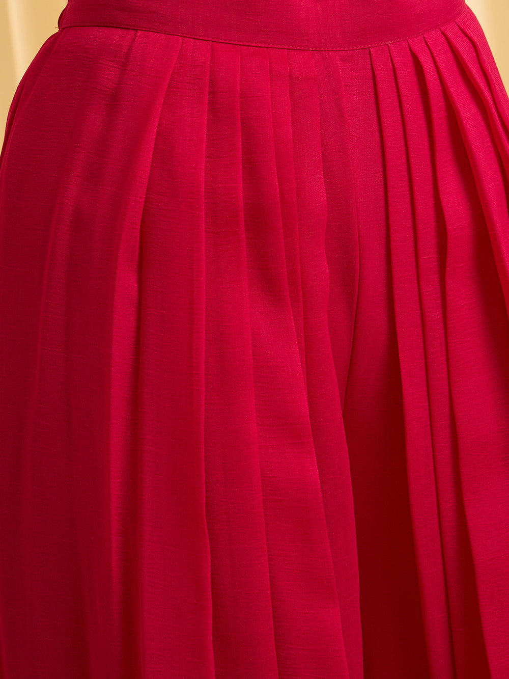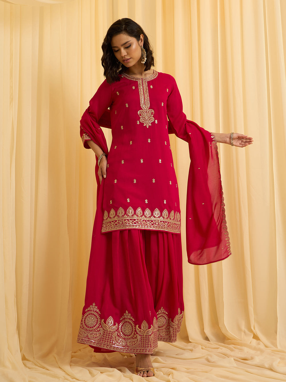 This striking red embroidered kurta and palazzo set is perfect for those who love vibrant colors with intricate details. The kurta is adorned with delicate golden embroidery around the neckline, featuring a regal paisley pattern that runs along the hem and sleeves. The rich red color is beautifully complemented by the gold threadwork, creating a festive and elegant vibe.