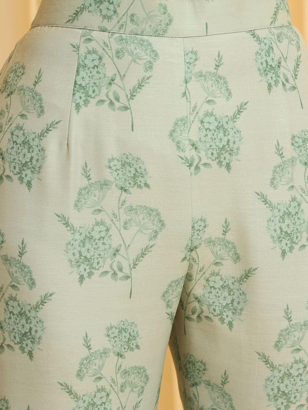 Turn heads with this elegant sage green ensemble featuring a straight kurta paired with dramatic printed sharara pants. The kurta is adorned with intricate embroidery on the yoke, highlighted with delicate bead and tassel detailing, adding a regal touch. The soft printed fabric brings a refreshing vibe, making it a perfect pick for festive gatherings, mehendi, sangeet, or family celebrations.