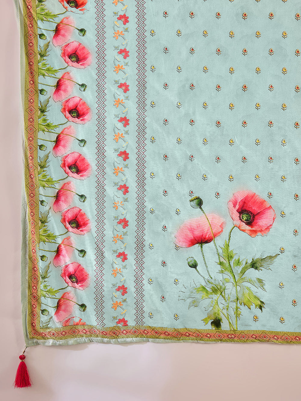 This enchanting turquoise Anarkali suit combines delicate floral embroidery with a vibrant poppy design at the hem. The soft flowy fabric and intricate detailing make it a perfect choice for a wedding, festive occasion, or a special celebration.