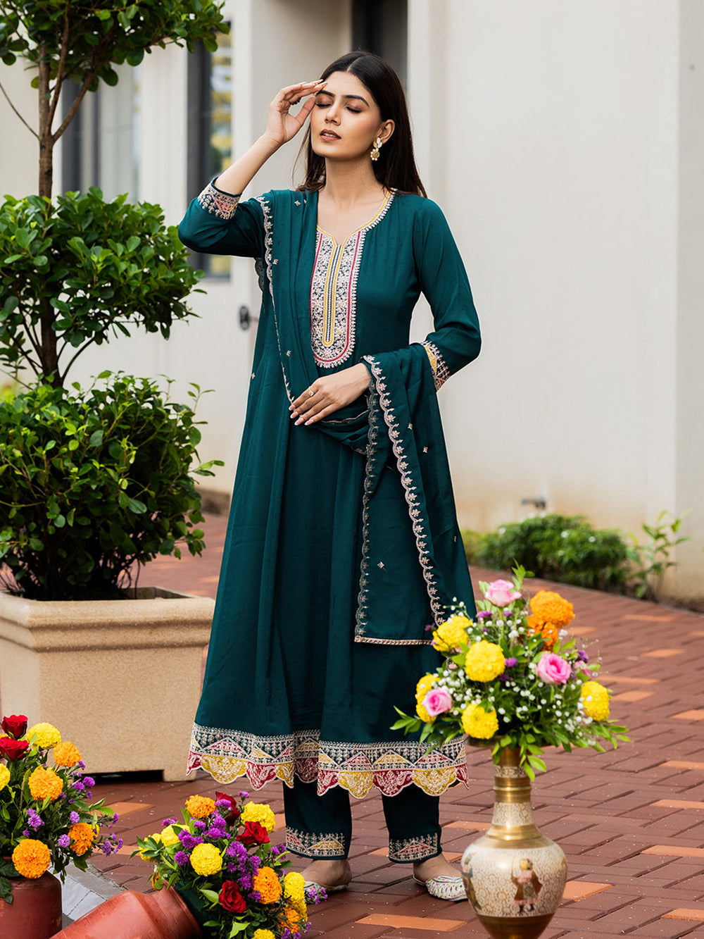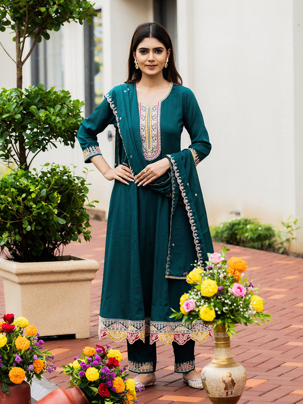 Celebrate tradition in style with this radiant Teal Green kurta set, perfect for festive and cultural occasions. The flowy kurta features intricate mirror and thread embroidery along the neckline and hemline, paired with ankle-length embroidered pants and a sheer dupatta that brings elegance and charm. The ensemble is a harmonious blend of bright hues and traditional craftsmanship.