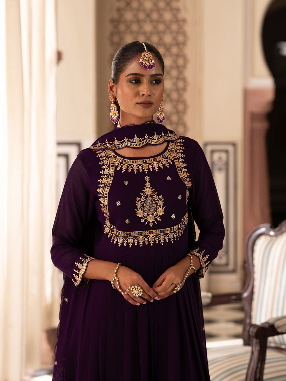 Step into the world of luxury with this Luxurious Purple Anarkali Suit Set. The rich purple hue, paired with intricate golden embroidery, gives a regal touch to your festive wardrobe. Perfect for weddings, festivals, or any formal gathering, this ensemble will ensure you make a lasting impression.