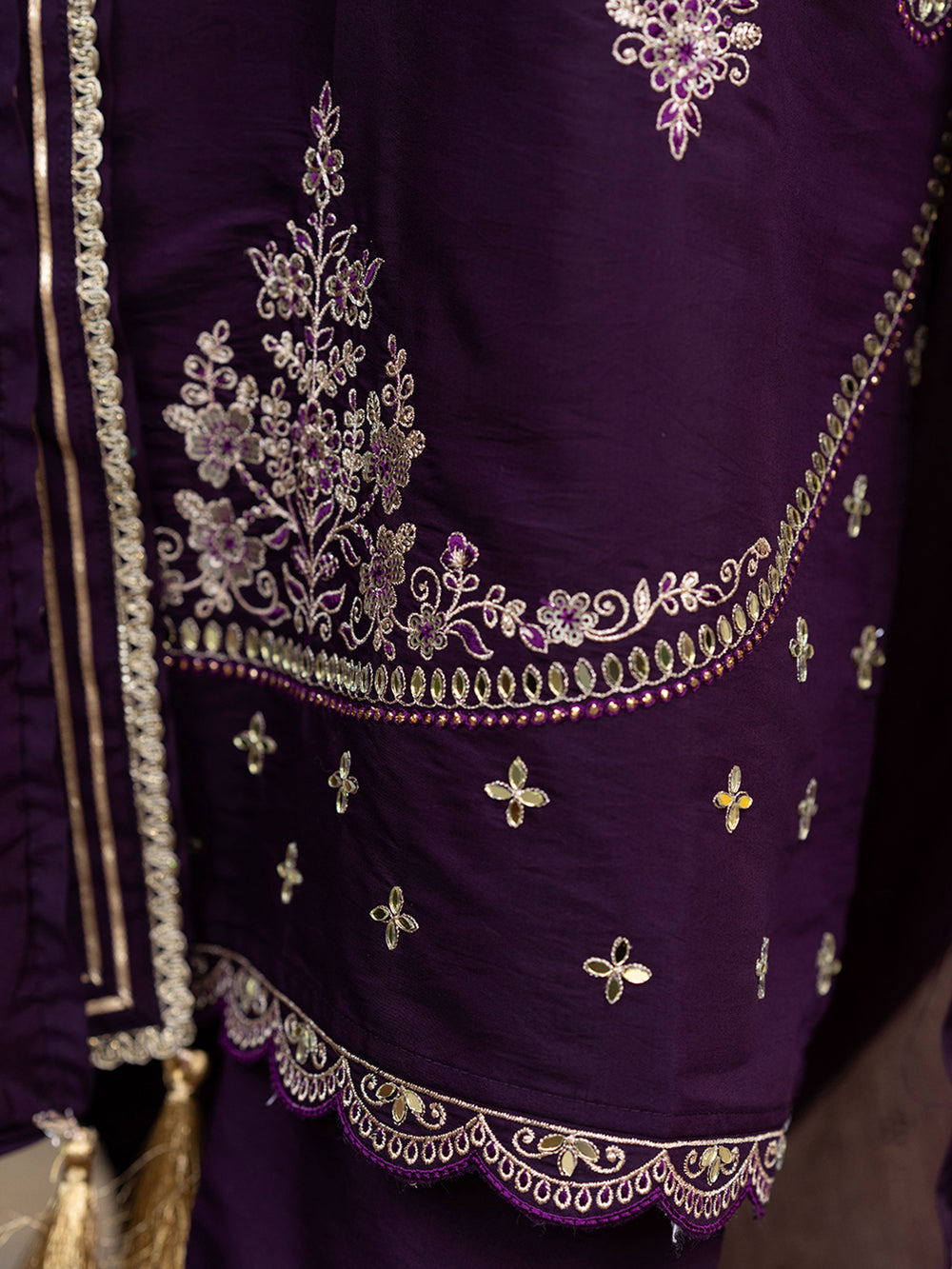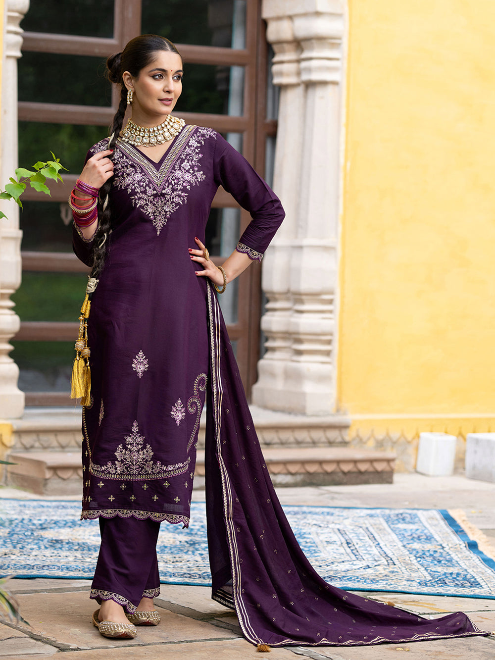 This regal purple Anarkali suit exudes elegance and charm, perfect for weddings, festivals, or any formal celebration. With intricate gold threadwork embroidery on the neckline, sleeves, and hem, this outfit offers a perfect blend of tradition and contemporary style. The set includes a stunning tunic, matching churidar, and an embroidered dupatta, making it an ideal choice for any special occasion.