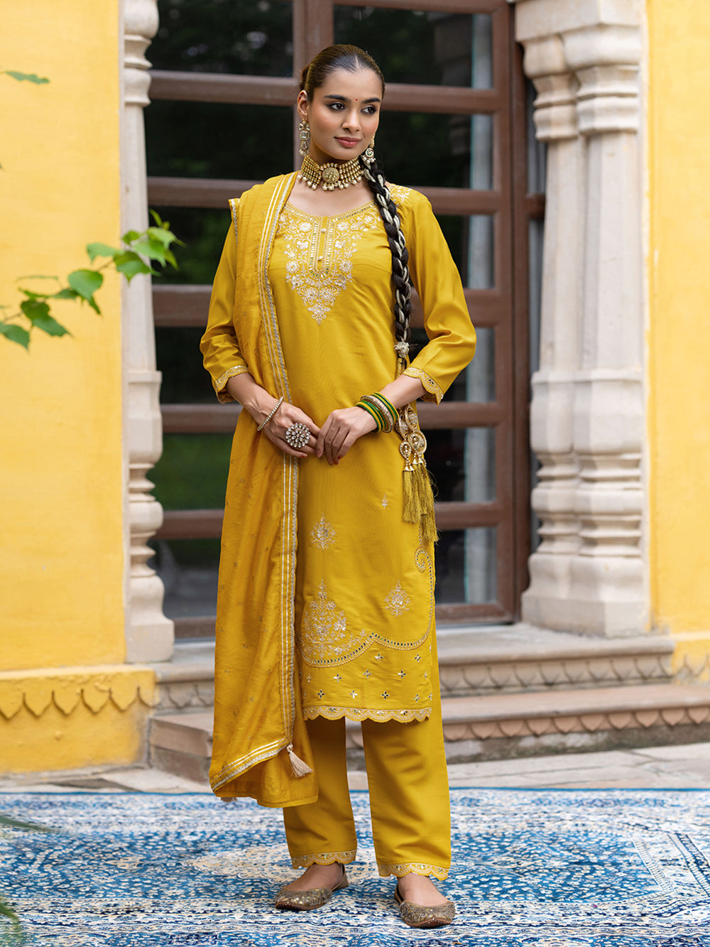Step into timeless elegance with this stunning yellow Anarkali suit set, designed to make you feel like royalty. Crafted with intricate embroidery and exquisite details, this outfit is perfect for weddings, festivals, or special occasions. Featuring a beautifully adorned neckline and delicate patterns, the outfit combines traditional charm with modern sophistication.